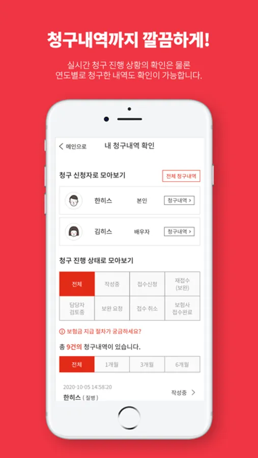 - 실시간 청구 진행 상황의 확인은 물론 연도별로 청구한 내역도 확인이 가능합니다.