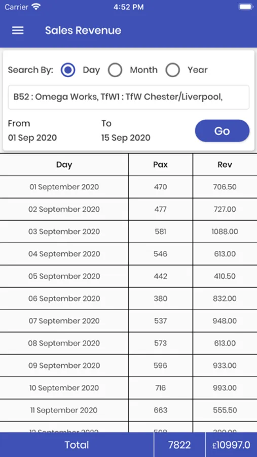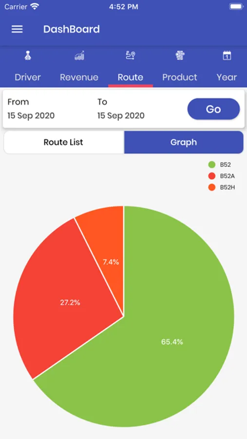 The user can see summary reports including driver revenue, route summary, product summary etc..