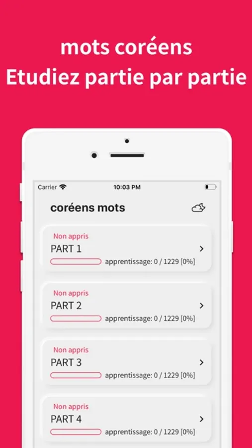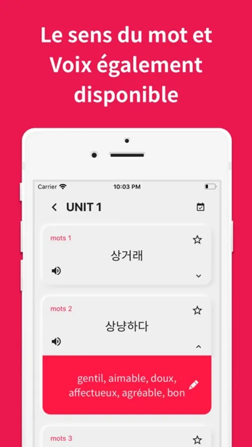 -Fournit une fonction pour revoir tous les mots coréens par partie, unité et