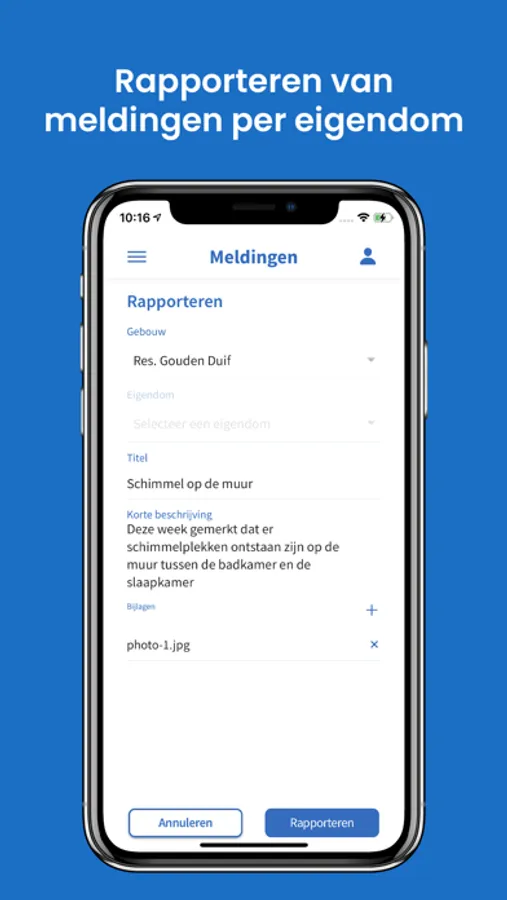 - Een overzicht van de bestaande technische meldingen en het aanmaken van nieuwe inclusief bijlagen.