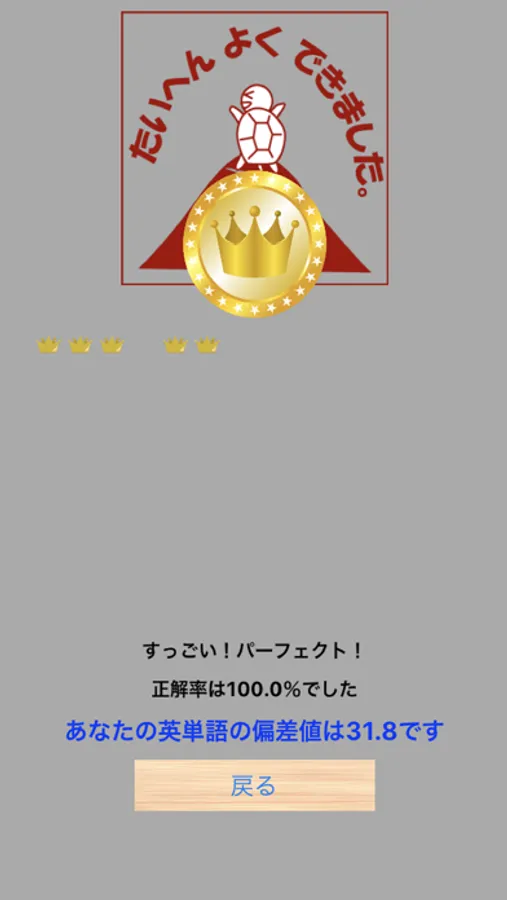 [テスト編]で満点合格をすると結果の画面に「星」が現れます。これをすべて集めるとキーワードが1文字現れます。「中1英単語」「中2英単語」「中3英単語」「公立英単語」「私立英単語」「超絶英単語」「神級英単語」の7つのアプリをコンプリートすると、英語の学習に関するあるメッセージになります。ぜひコンプリートできるように頑張ってみてください。