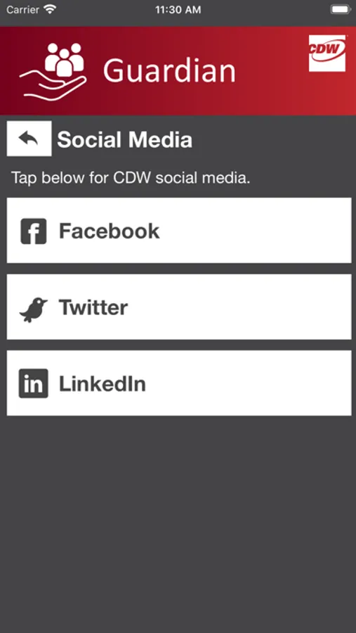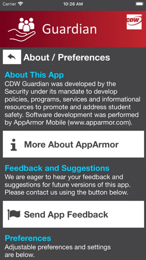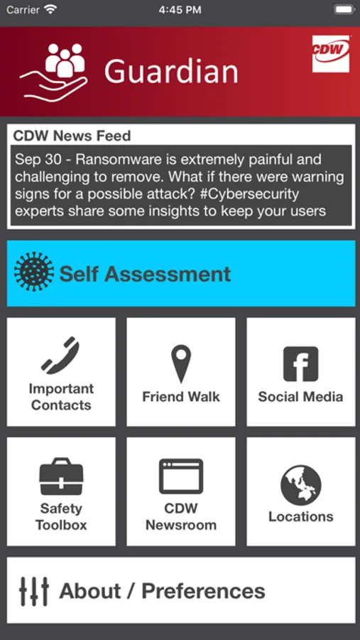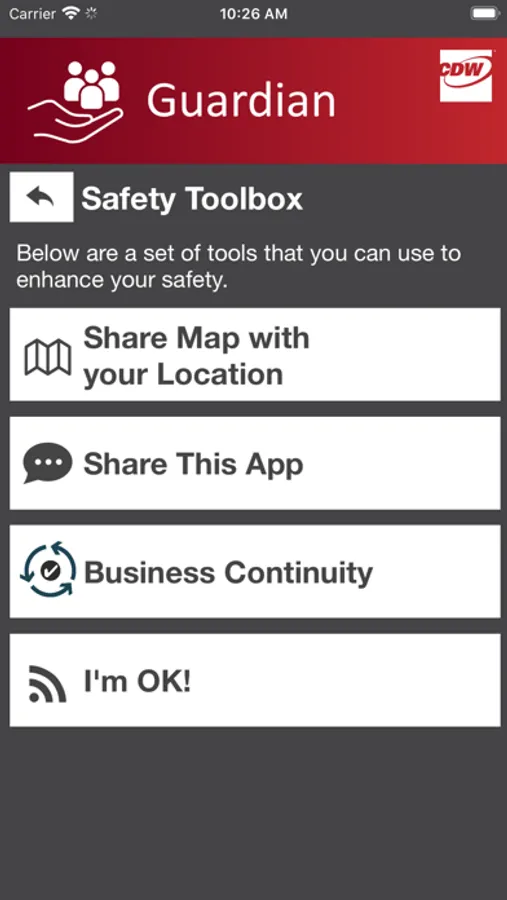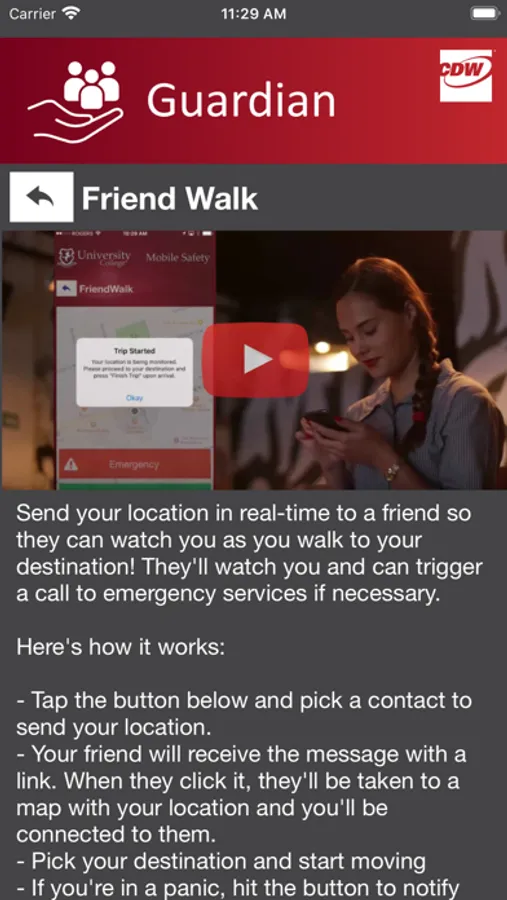 CDW Guardian is the official safety app of CDW. It is the only app that integrates with CDW's safety and security systems. CDW has worked to develop a unique app that provides staff and visitors with added safety. The app will send you important safety alerts and provide instant access to safety resources.