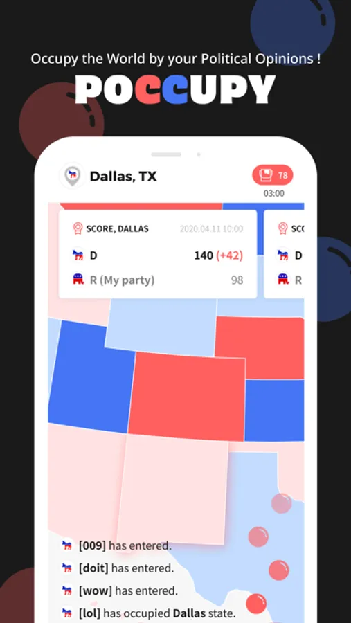 Poccupy is a virtual voting game where liberals and conservatives, left and right, and other political parties with different ideas compete to win the districts of each country.
