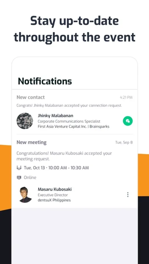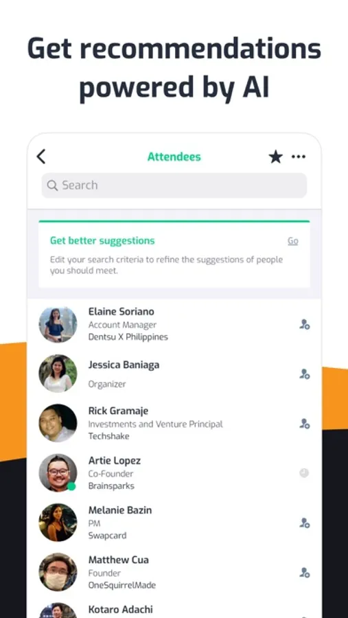 Create your own profile and include more information about you to let other attendees get to know you better such as your work experiences and contact details. The more information, the better the algorithm matches you to people you should meet!