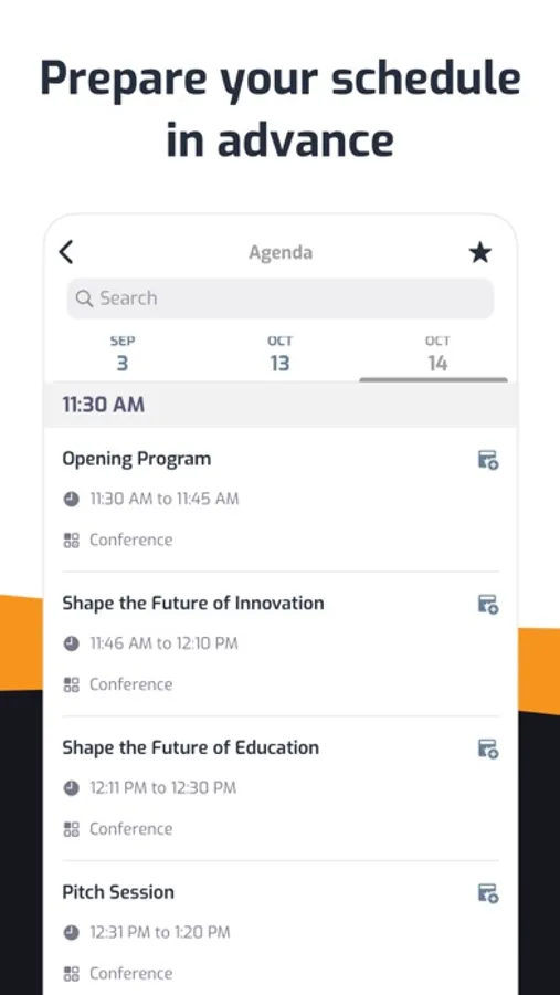 See your own schedule featuring your booked and favorited sessions. This feature will make sure to remind you to check in to every session you want to attend.
