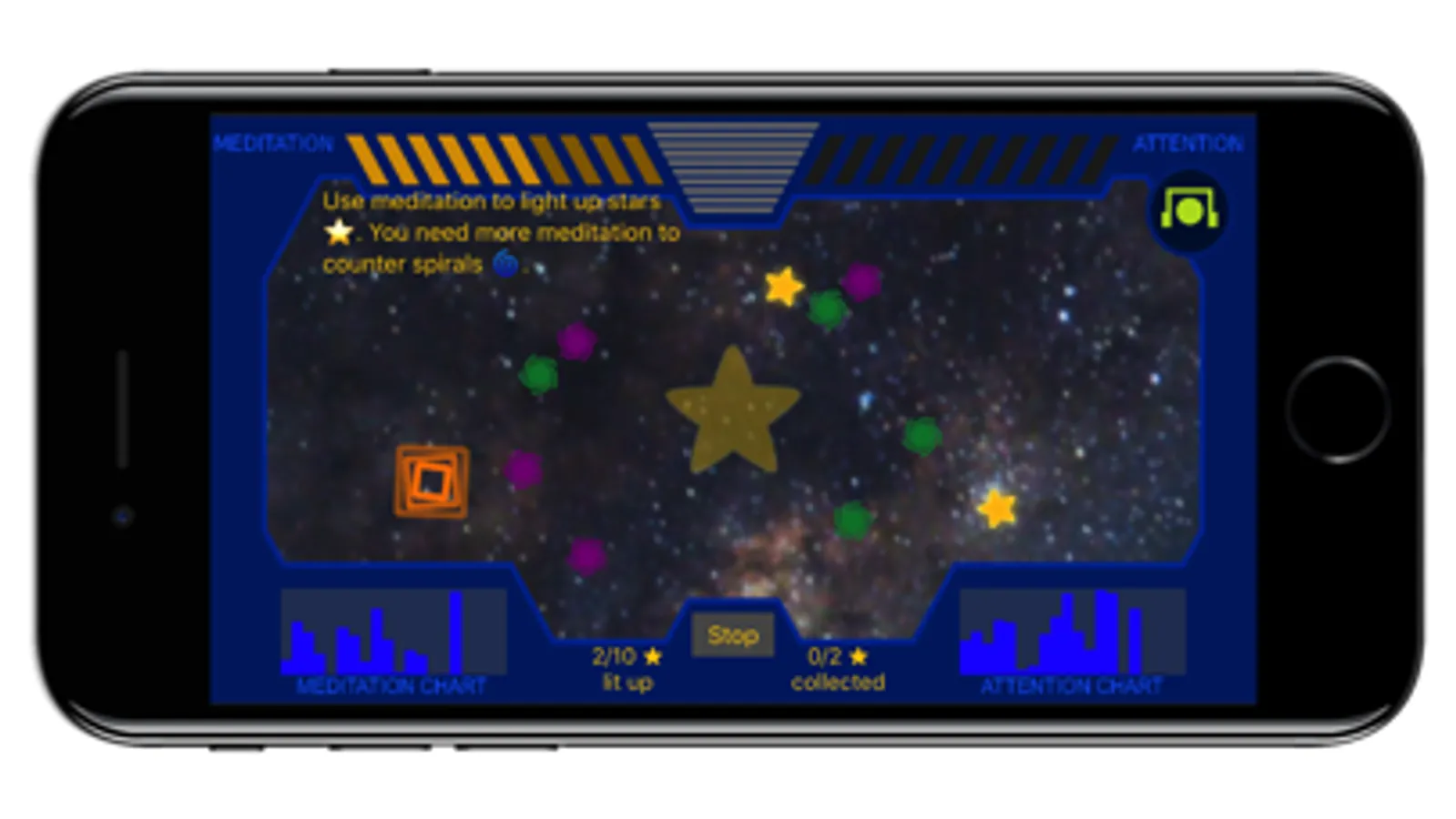 With meditation and attention levels read by an EEG headset from your brain, you light up starlets and drag them to the star.
