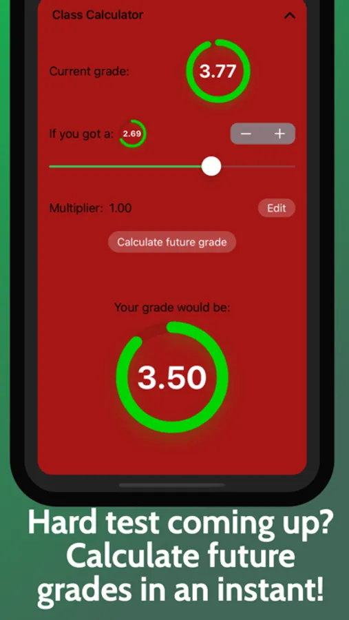 Stressed over your school grades? Download Grade-Saver, the grade book that helps you! Add all your classes, with their sections and grades! Then, when you'd like to see what would happen to your grade if you get a C on that test, or if you don't finish that homework assignment, you can use the grade calculator at the bottom of every class to see what your future grade would look like! Download GradeSaver today and take back control over your grades!