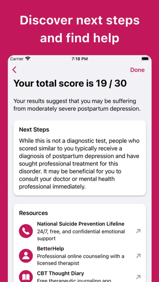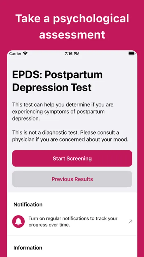 Disclaimer: This test is NOT a diagnostic test. A diagnosis can only be provided by a qualified healthcare professional. Please consult a physician or mental health professional if you are concerned about Postpartum Depression.