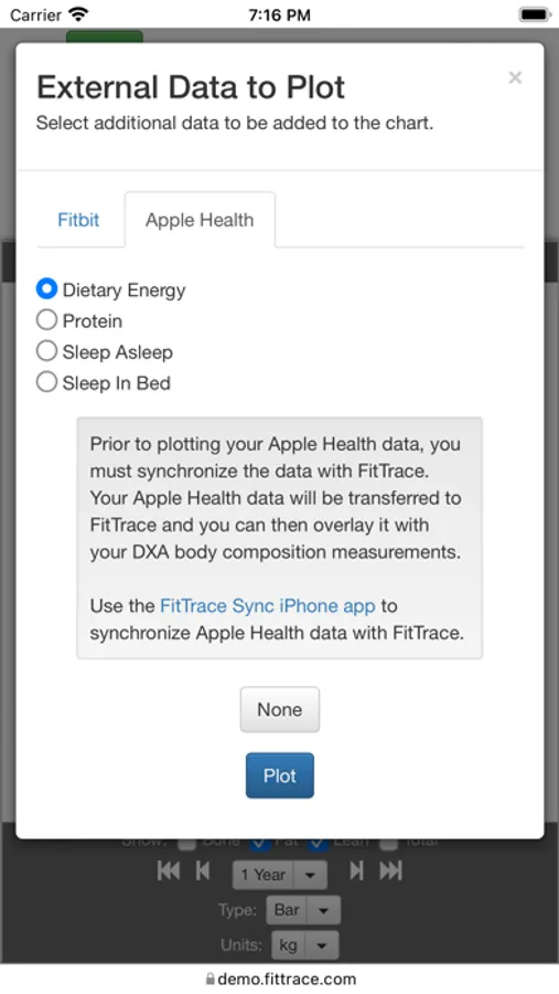 Upload your DXA data to Apple Health. The following DXA variables are available: weight, body fat percent, lean mass, and BMI. Note that FitTrace Sync uses your DXA total mass for weight and to calculate BMI. Also, Apple Health's definition of lean body mass is fat free mass to FitTrace.