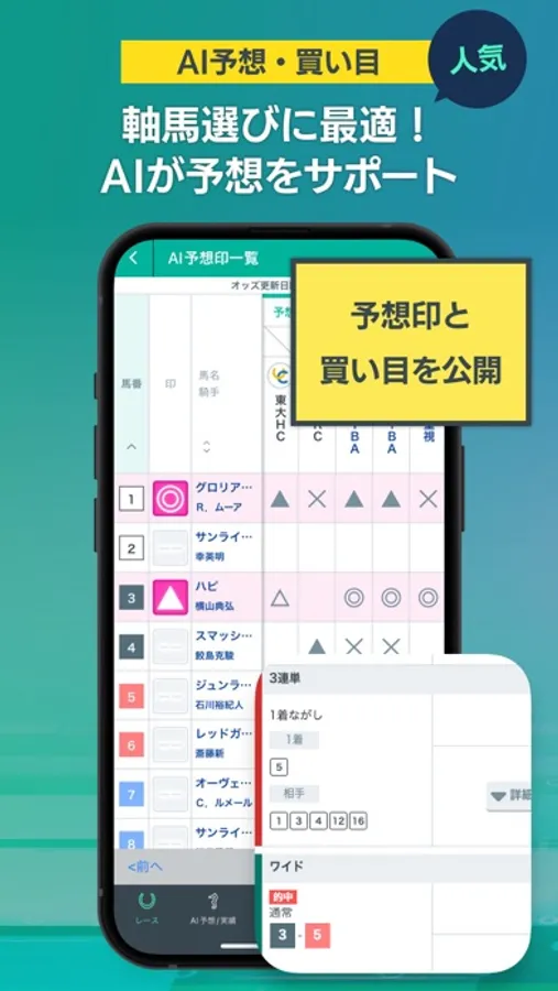 AI予想/実績では、過去12ヶ月分のAI予想家による予想レースと的中結果も無料掲載しています。