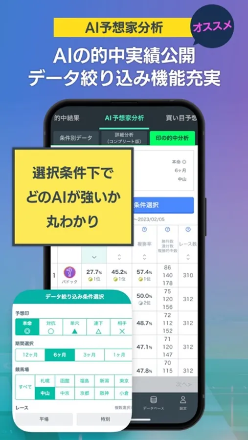 競馬場別やクラス別など複数の条件絞り込みによるAI予想家分析機能。予想したいレースと同じ条件で絞り込みすることで該当条件に強いAIの実績データを確認できます。