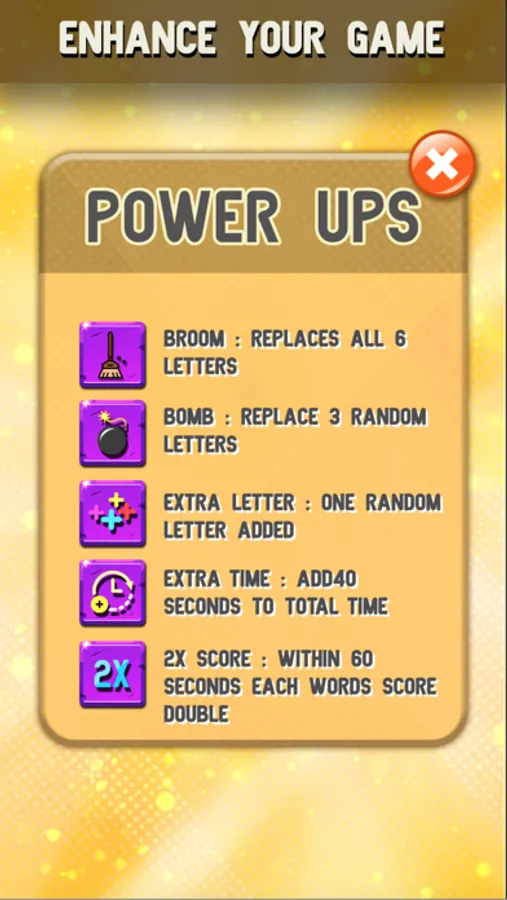 The longer the word, the higher point score. Win game Coins and Gems by scoring longer words and as many words as possible. Use your Coins and Gems to purchase Power Ups which can be used to change the play of the game. Don’t get too comfortable, because the roll of the dice can change everything. You get to choose the level of the plays, but chance and luck are your partners.