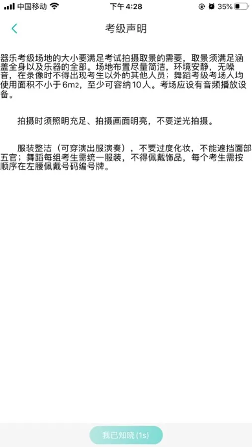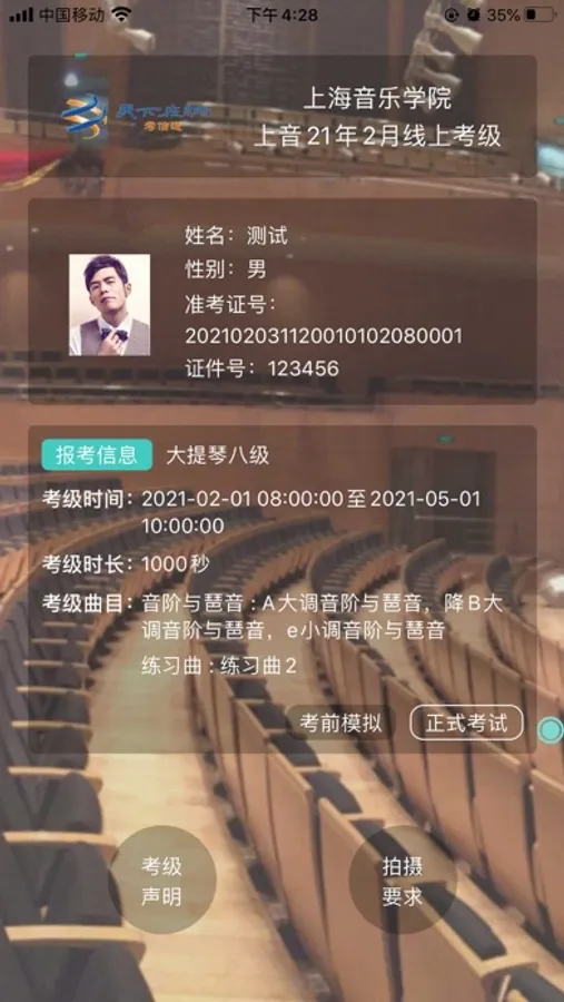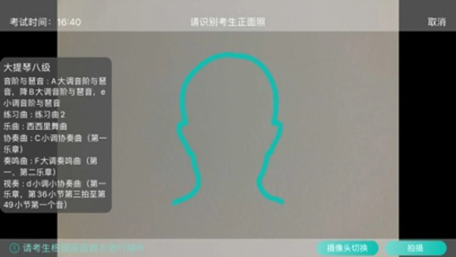 考生登录:考生通过准考证号和身份证号码进行登录后,显示考生信息,考生须先查看各考级机构的考级声明要求、拍摄要求,才可进行模拟考试和正式考试。点击模拟考试,模拟开始,先拍摄考生正面照片,然后点击开始考试,屏幕会出现考生所报考的乐器虚线框以及考级曲目,按照虚线框要求进行视频拍摄。演奏完毕可直接点击结束考试,考试规定时间到,考试也会自动结束。模拟考试完成后,可进行正式考试。点击正式考试,考试开始,先拍摄考生正面照片,然后点击开始考试,屏幕会出现考生所报考的乐器虚线框以及考级曲目,按照虚线框要求进行视频拍摄。演奏完毕可直接点击结束考试,考试规定时间到,考试也会自动结束。