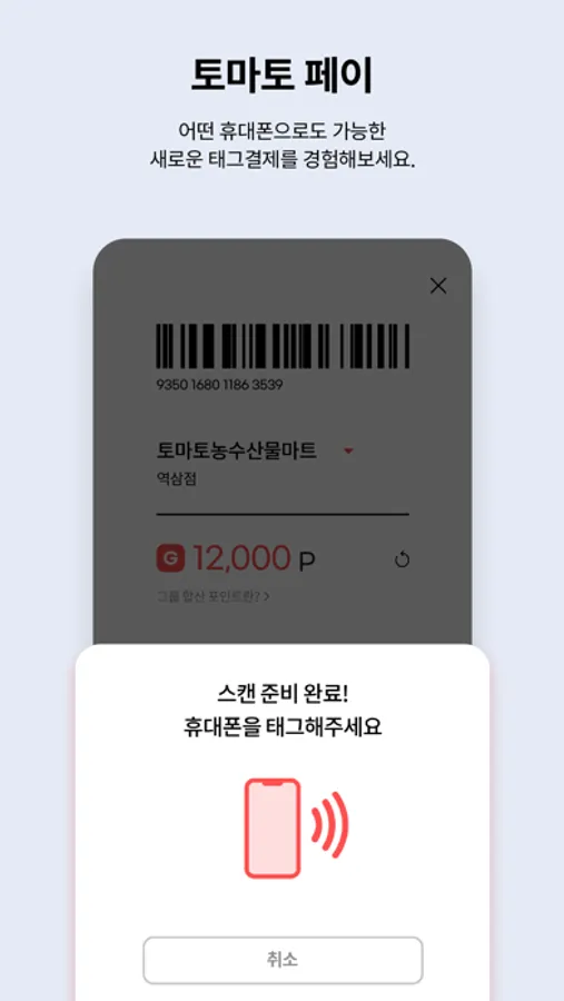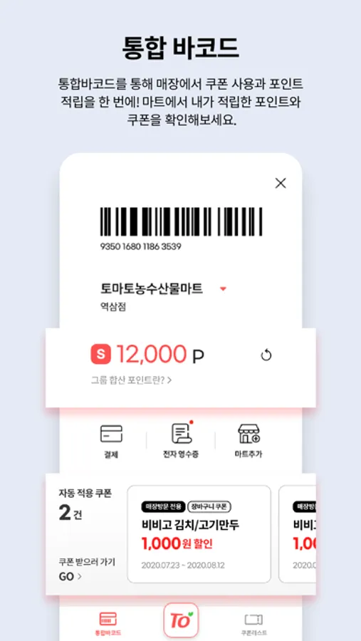 통합바코드를 통해 매장에서 쿠폰 사용과 포인트 적립을 한 번에 할 수 있습니다.