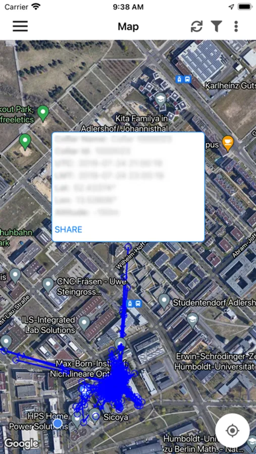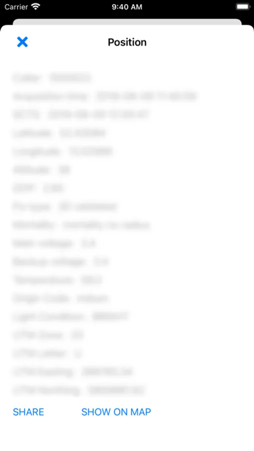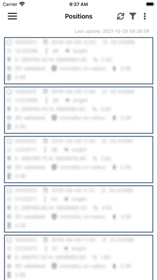 All this data is displayed in tables and can be filtered. In addition to all this data being displayed in tables, the Position data is also shown on a map. This map supports multiple features, such as showing the device's current position and different map layers (satellite, terrain, etc). All the data that is downloaded by the application is stored in a local database on the device. As a result, you can login and see already downloaded data even when your device does not have Internet access.