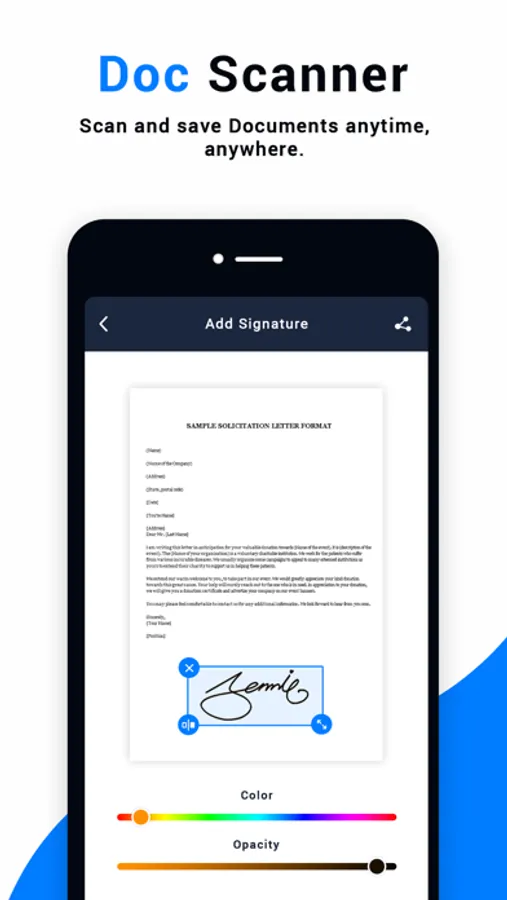 Capture document by phone, remove busy background, generate high-resolution JPEG or PDF file with your signature