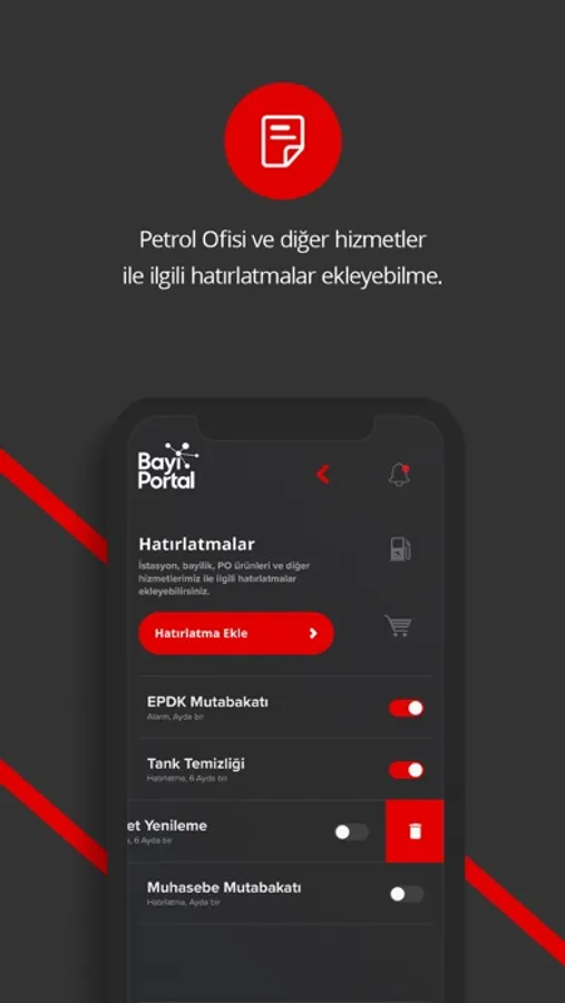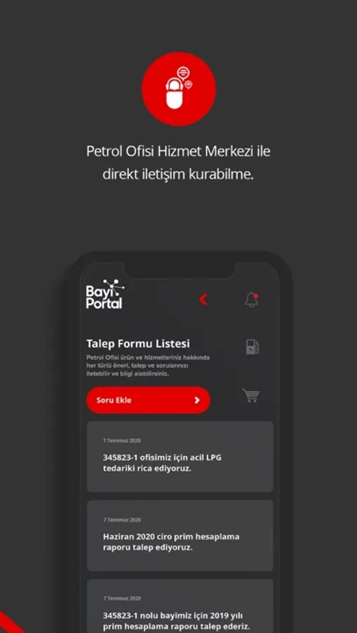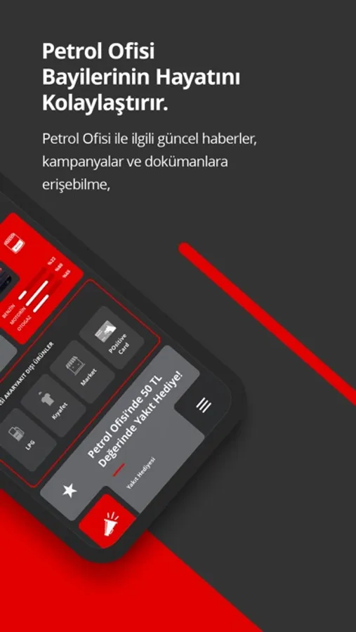 Petrol Ofisi’nin yeni Bayi Portal uygulaması ile Petrol Ofisi hakkında duyurular, kampanyalar, sipariş ekranları ve bildiriler her an elinizin altındadır. Günlük satışlarınızı, tank seviyenizin takibini anlık olarak kolaylıkla yapabilir, satış raporlarınıza ulaşabilirsiniz. Petrol Ofisi ve ihtiyaç duyduğunuz diğer hizmetler ile ilgili hatırlatmalar ekleyerek, uygulamanın sizi periyodik olarak bilgilendirmesini sağlayabilirsiniz.
