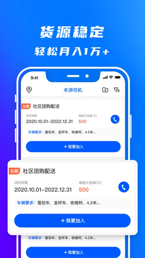丰湃司机是顺丰同城旗下,专注同城货物运输的货运平台,作为司机版,我们提供海量【长期项目】,您可以即刻加入项目,轻松接单,开始赚钱!