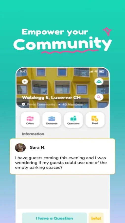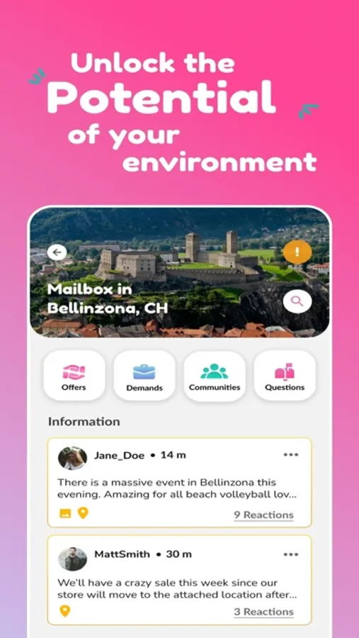 Communities have their own feed (content collection to scroll) and can buy their own mailboxes. In their feeds and mailboxes, posts, offers, demands, questions and information can be shared.