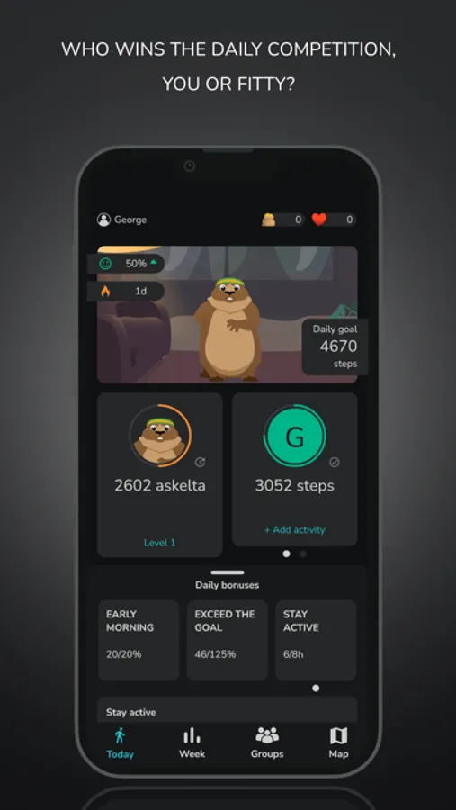 Fitty Murmel is a virtual exercise buddy whose characteristics reflect yours. With Fitty Murmel, you will find local sports venues on a map, track your progress, challenge your friends / colleagues and build a better lifestyle for yourself and to your peers. Complete daily challenges, collect rewards and defeat your bad habits.