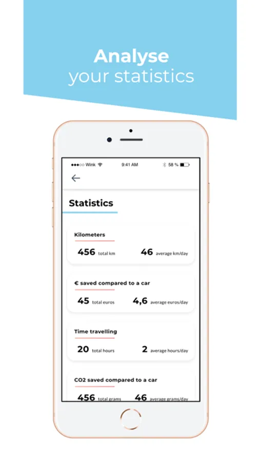- Statistics: get information on kilometers and time travelled, € and CO2 saved compared to a car...