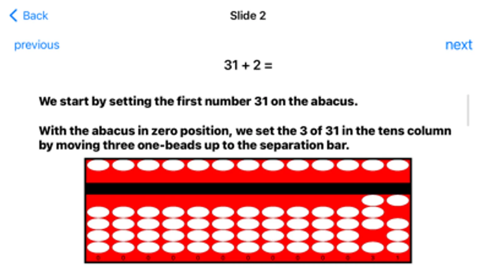 • Abacus operations that are explained in great details using purposefully chosen examples