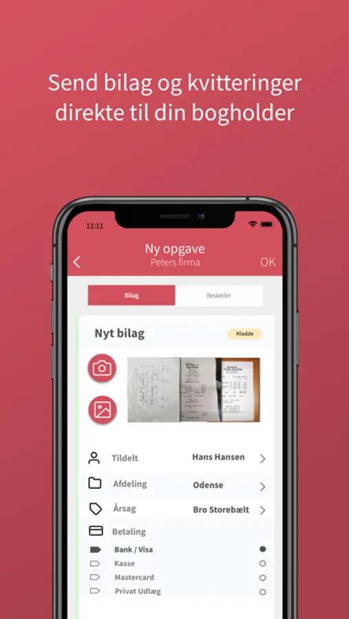 Dine Tal & Tanker er din nemme løsning til at håndtere bilag. Du kan tage billeder af dine bilag eller fakturaer og sende dem direkte til din bogholder med mulighed for at vælge afdeling, projekt, årsag og betalingsmetode.