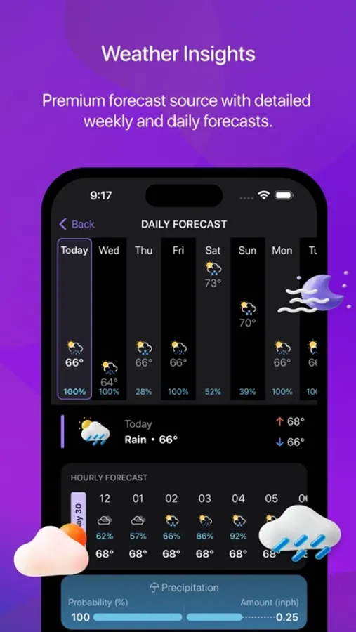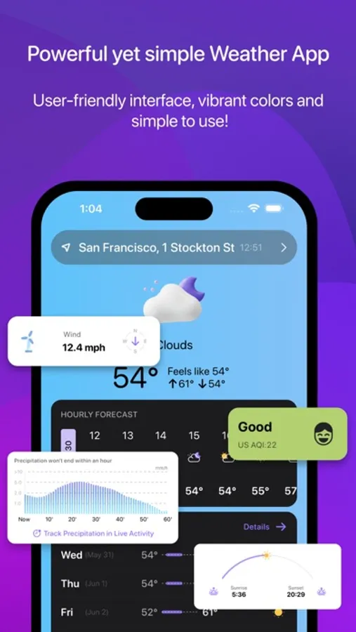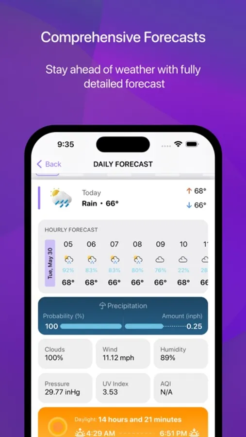 Get 16-day daily and 400-hour hourly forecasts with HeyWeather, including temperature, real feel, precipitation, and more. Track rain, snow, and extreme conditions effortlessly.