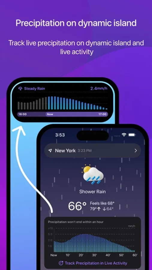 Stay informed about real-time precipitation with live updates on your lock screen or dynamic island. Updates continue as long as the rain persists in your area.