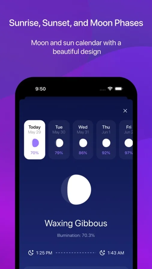 Discover sunrise, sunset, moon phases, and other astronomical information up to 28 days ahead, all presented in a beautiful design.