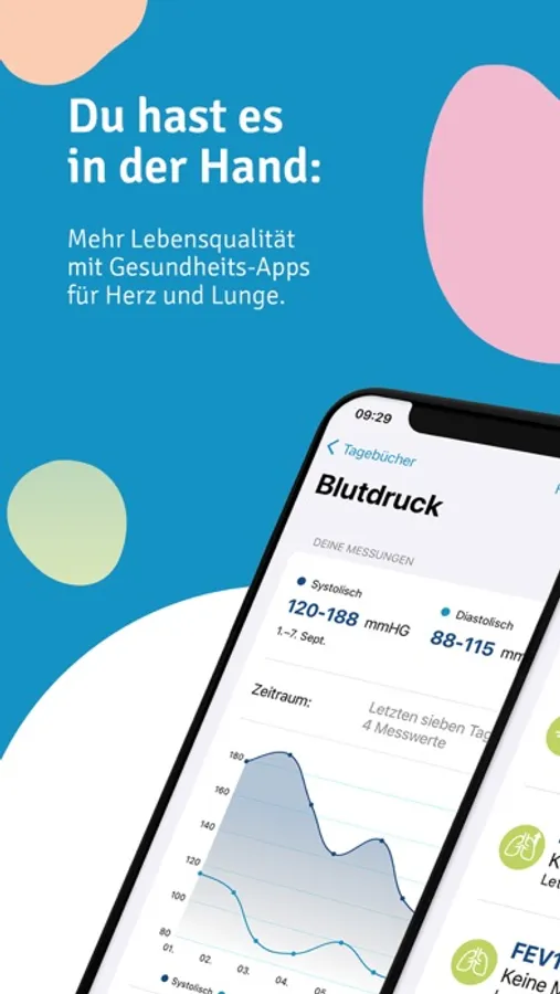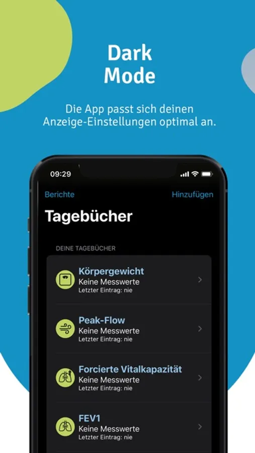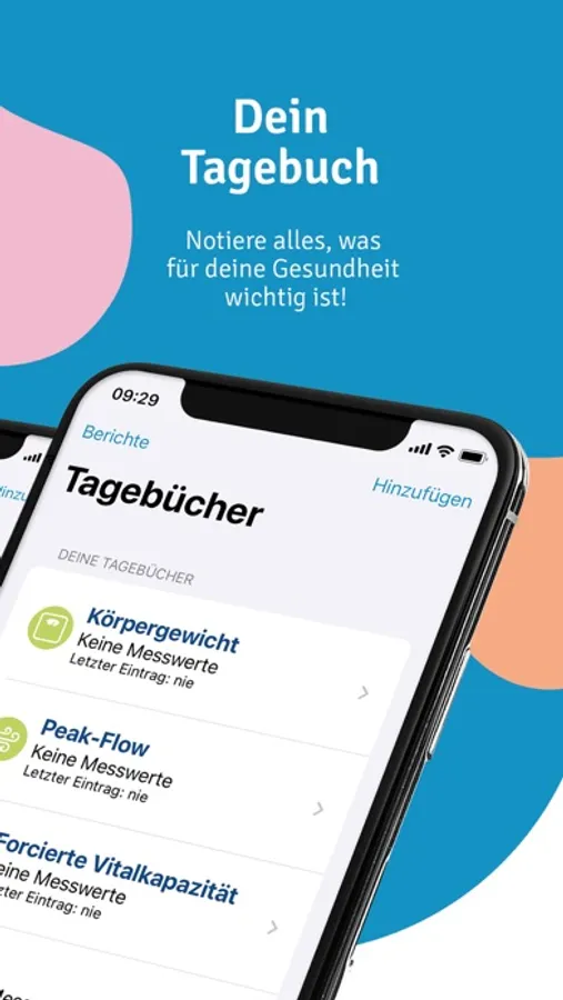 Gesundheitstagebuch: Trage deine Vitaldaten wie Blutdruck, Puls, Peak Flow (PEF), forcierte Vitalkapazität (FVC), Einsekundenkapazität (FEV1), Sauerstoffsättigung, Schritte und Gewicht in dein digitales Gesundheitstagebuch ein oder erfasse sie mit einem Bluetooth-fähigen Messgerät und übertrage sie direkt in die App. Die Darstellung deiner Werte erfolgt in übersichtlichen Kurven und Diagrammen. Auch ein Export deiner Daten als PDF-Datei ist möglich.