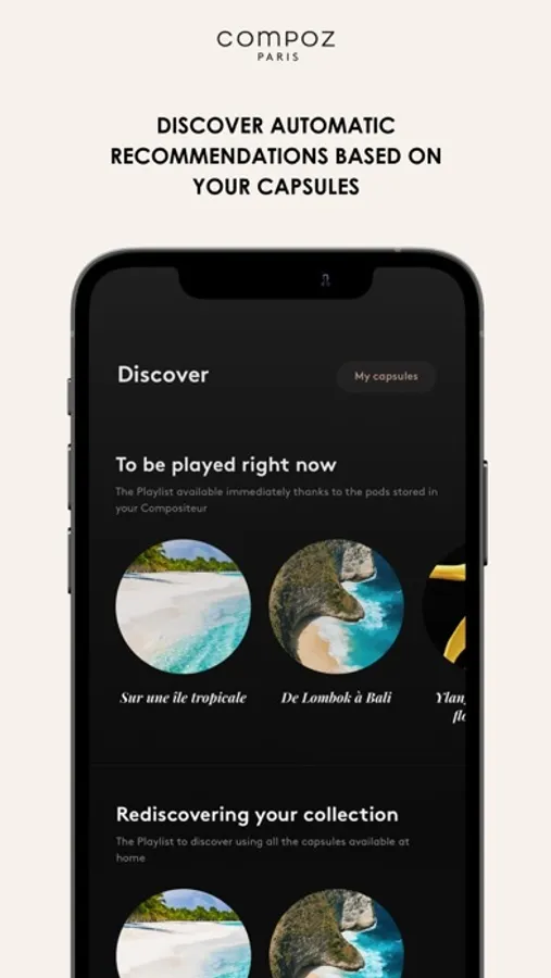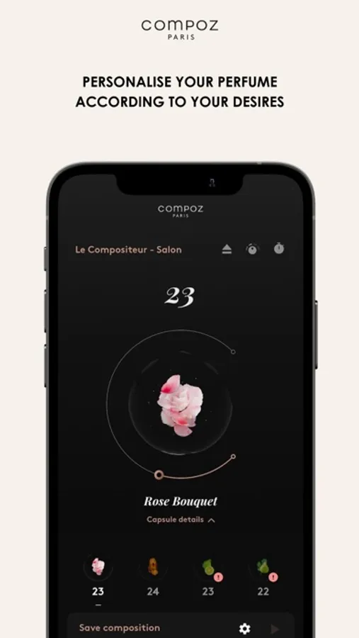The intelligent algorithm of the Compoz Paris app suggests compositions based on the collection of capsules you own.