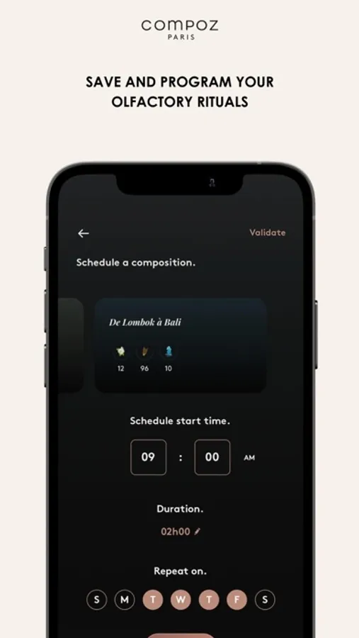 Schedule your diffusion calendar to create customized olfactory rituals: choose the day, time, and duration of diffusion, and let the Compositeur take care of the rest.