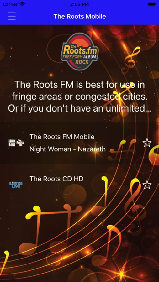 Our primary stream is 64K HE-AAC+ which provides high-quality sound and still works well on mobile devices. Our second stream, The Roots HD, is 128K HE-AAC, close to CD quality. You will never hear an MP3 format file on The Roots. Fm. Only uncompressed digital files.