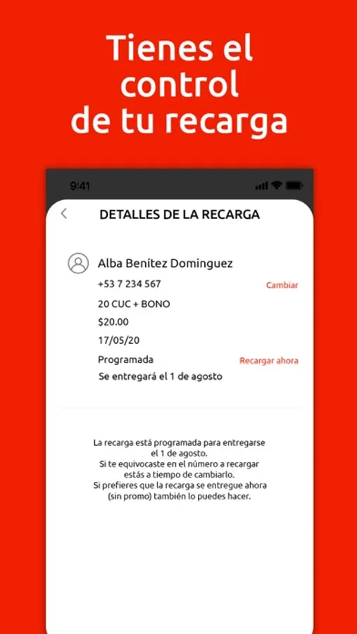 We give you the option to recharge instantly or schedule your recharge. If you make a mistake in the number when you schedule your recharge, you can change it yourself from the app or if you prefer not to wait and recharge at that moment, you can also do it, without having to contact customer service.