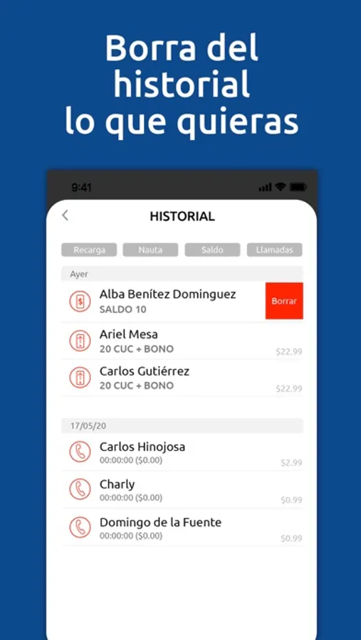 In aCuba you have control. You can manage your history as you please, delete the calls, recharges or payments that you do not want to be seen in your account. In protecting your privacy, nobody beats us.