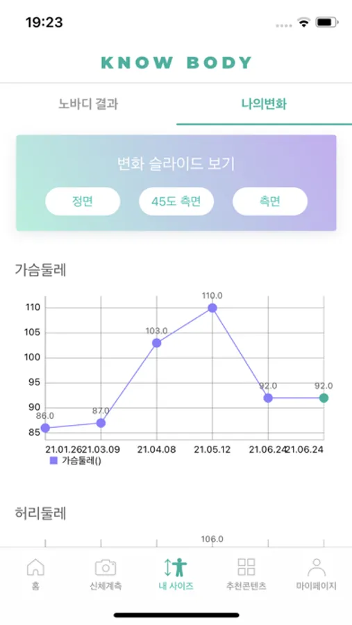 - 변화 슬라이드 : 나의 체형 히스토리를 관리할 수 있도록 정면/ 45도 측면 / 측면을 슬라이드쇼로 변화된 나의 체형을 확인해 보세요
