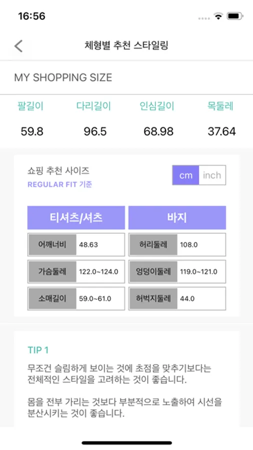 - 체형별 추천스타일링 : 분석 된 체형에 맞는 추천 스타일링 Tip을 제공합니다.