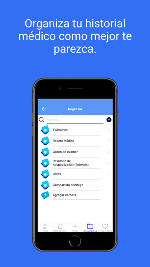 Podrás organizarlos como mejor te parezca: Por especialidad, fechas, tipo de documentos, órdenes médicas, consultas, y boletas entre otros, o podrás crear tus propias carpetas. También podrás generar recordatorios para la toma de medicamentos y tratamientos.