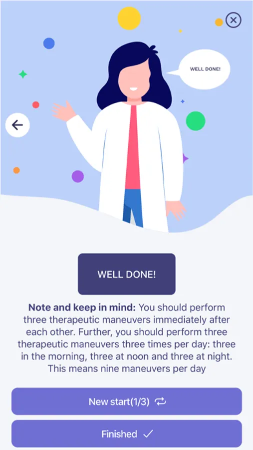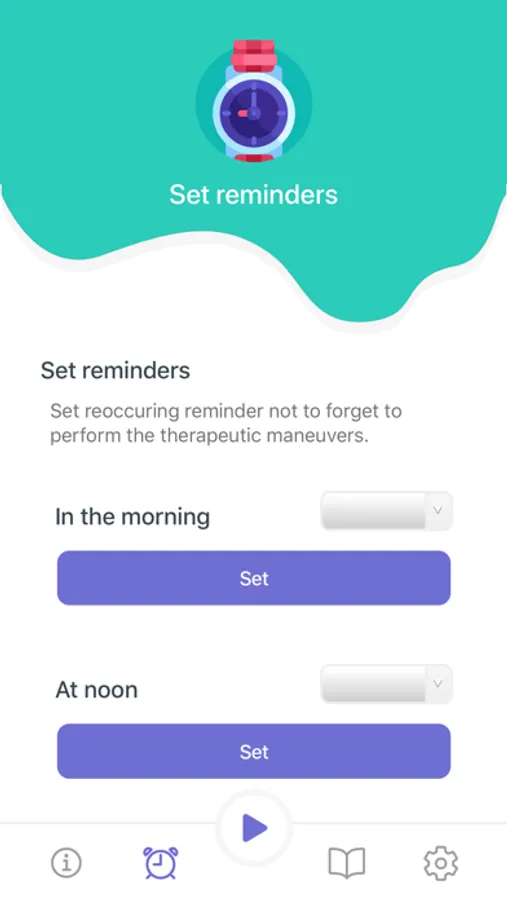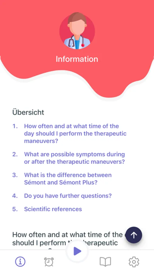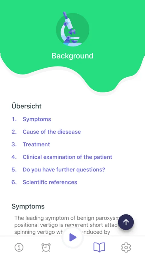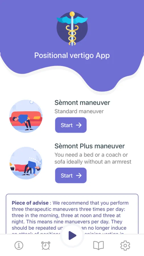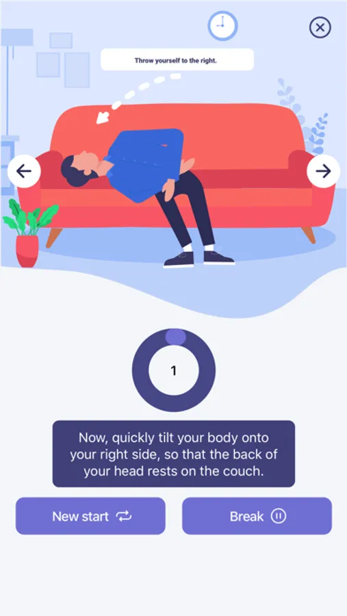 This app helps you with performing the exercises to treat your positional vertigo. By providing a timer, while showing the exercise to perform, it supports you during the correct execution of the treatment and helps you to recover more quickly.
