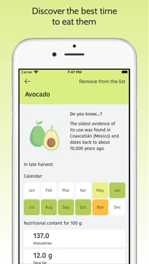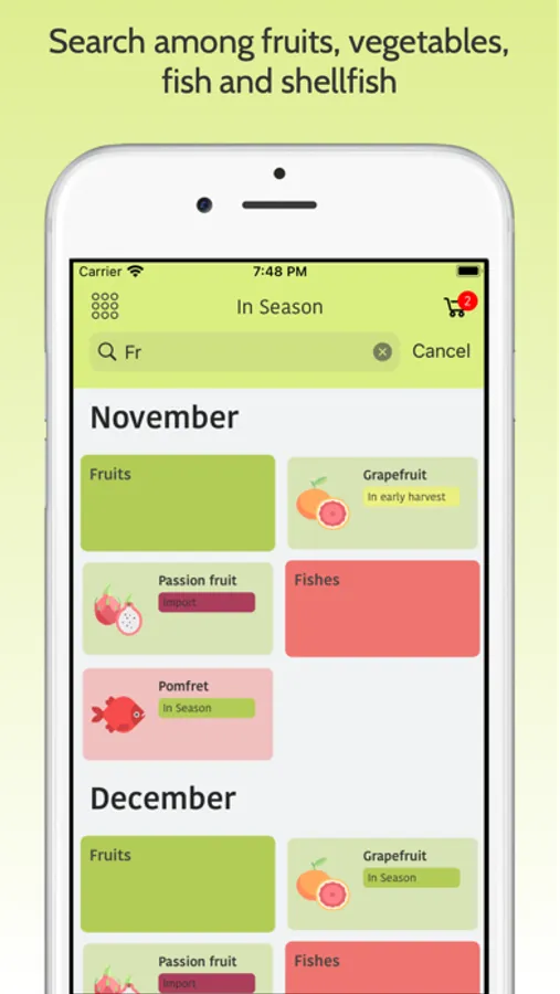 Here you can find out if a food is within its recommended harvesting or fishing season, if it is in an early or late phase of that season or if the food is imported.