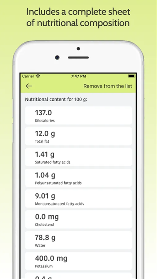 As a complement to all this information we have added a shopping list so that you can save your favorite foods and always have them accessible.