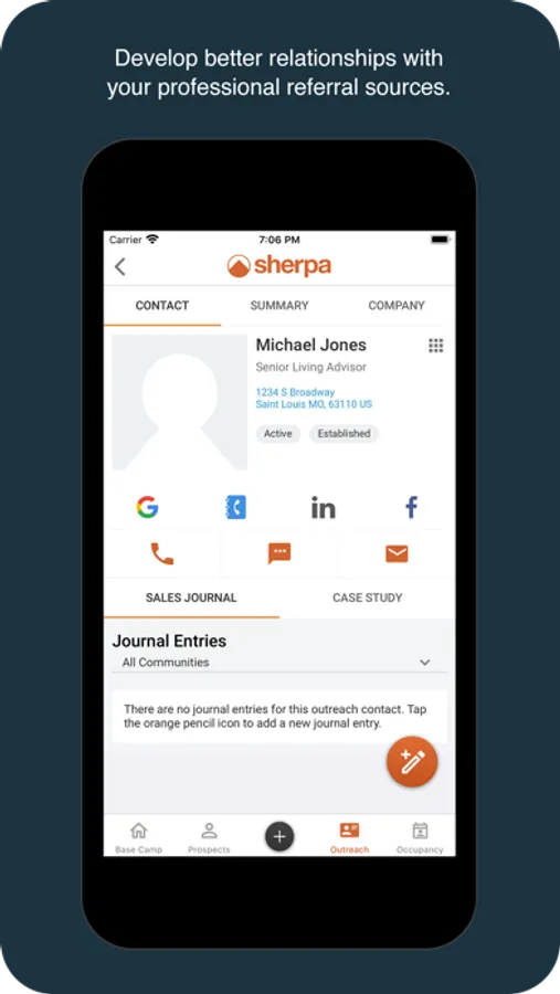 The Sherpa CRM app helps you monitor individual and team progress including Time in the Selling Zone® as well as specific sales activities. You can add new prospects/outreach contacts and create sales journals or case studies all using your mobile device.