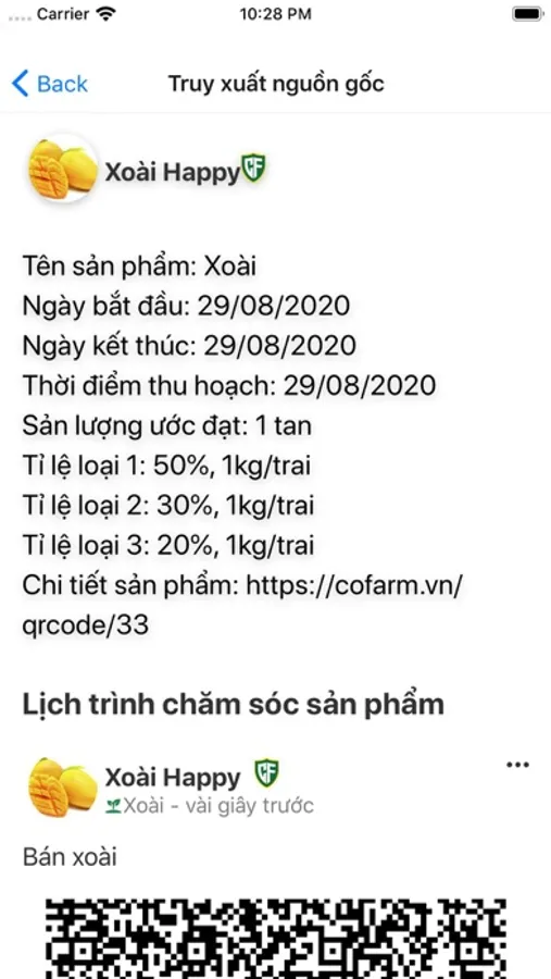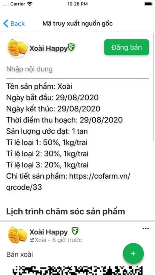 Cofarm là một Nhật ký điện tử theo thời gian thực, giúp người sản xuất nông nghiệp dễ dàng xây dựng câu chuyện cho từng sản phẩm của mình. Bên cạnh đó Cofarm cho phép người dùng tạo ra Mã Truy xuất nguồn gốc Qr theo từng vụ/đợt canh tác.