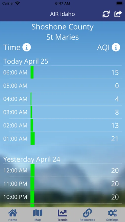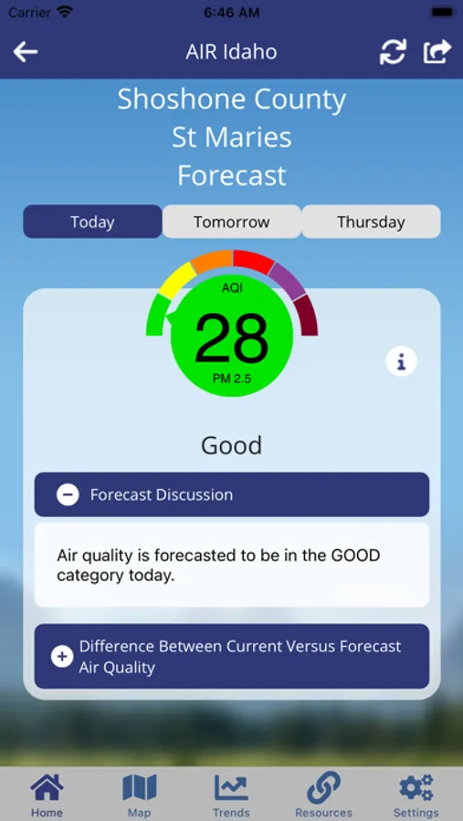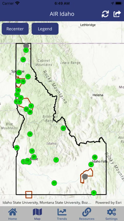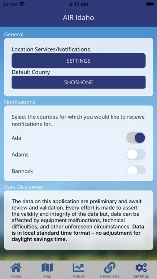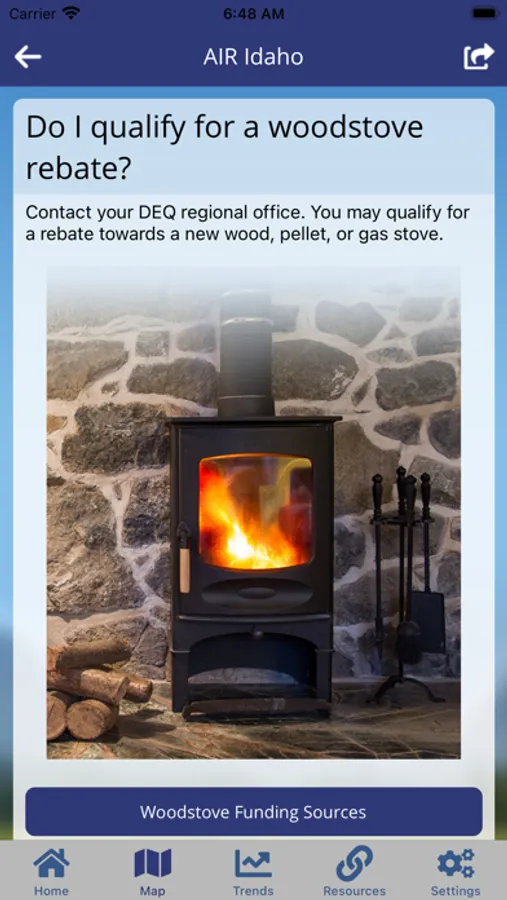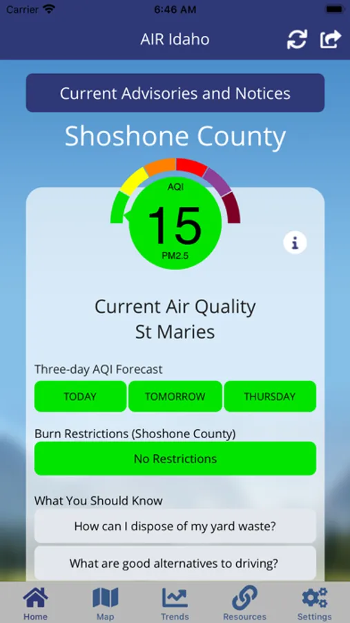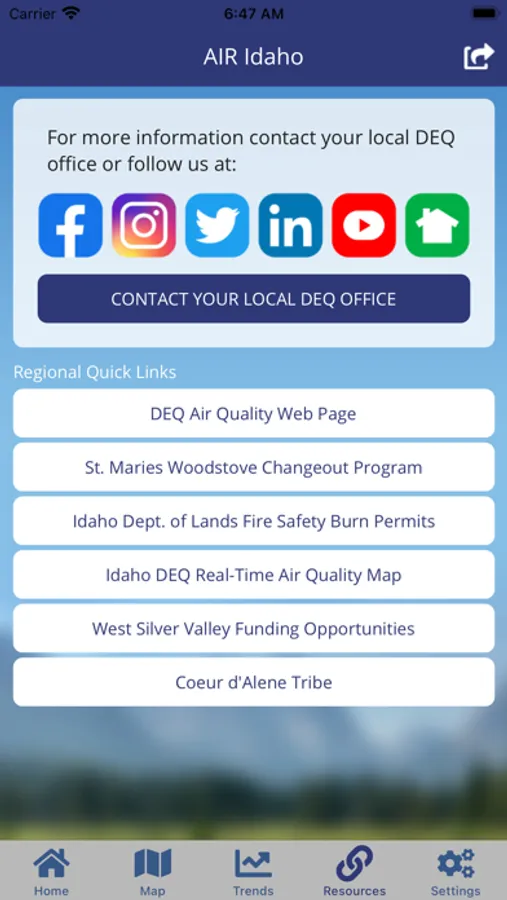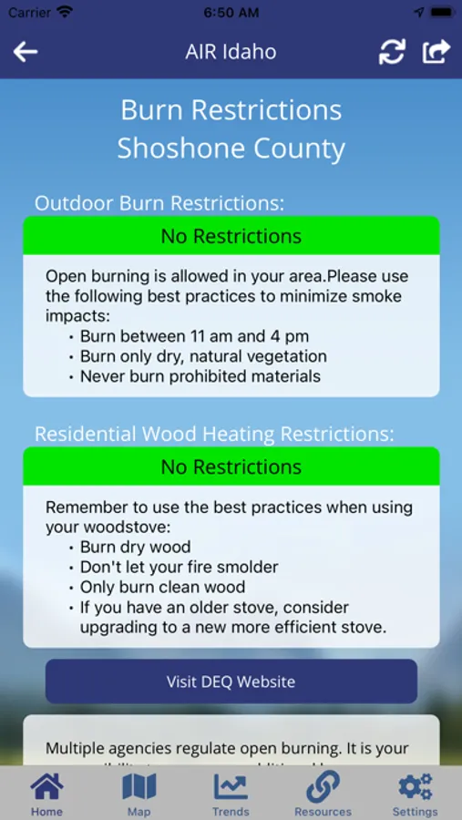 The Idaho Department of Environmental Quality’s (DEQ) AIR Idaho app provides forecasted and real-time air quality information. The app displays current air quality data, air quality forecasts, open burning restrictions, and tips on how to protect the air and your health. Enable notifications to receive information on local air quality advisories and burn restrictions. Display air quality data by choosing a county or enabling location services.