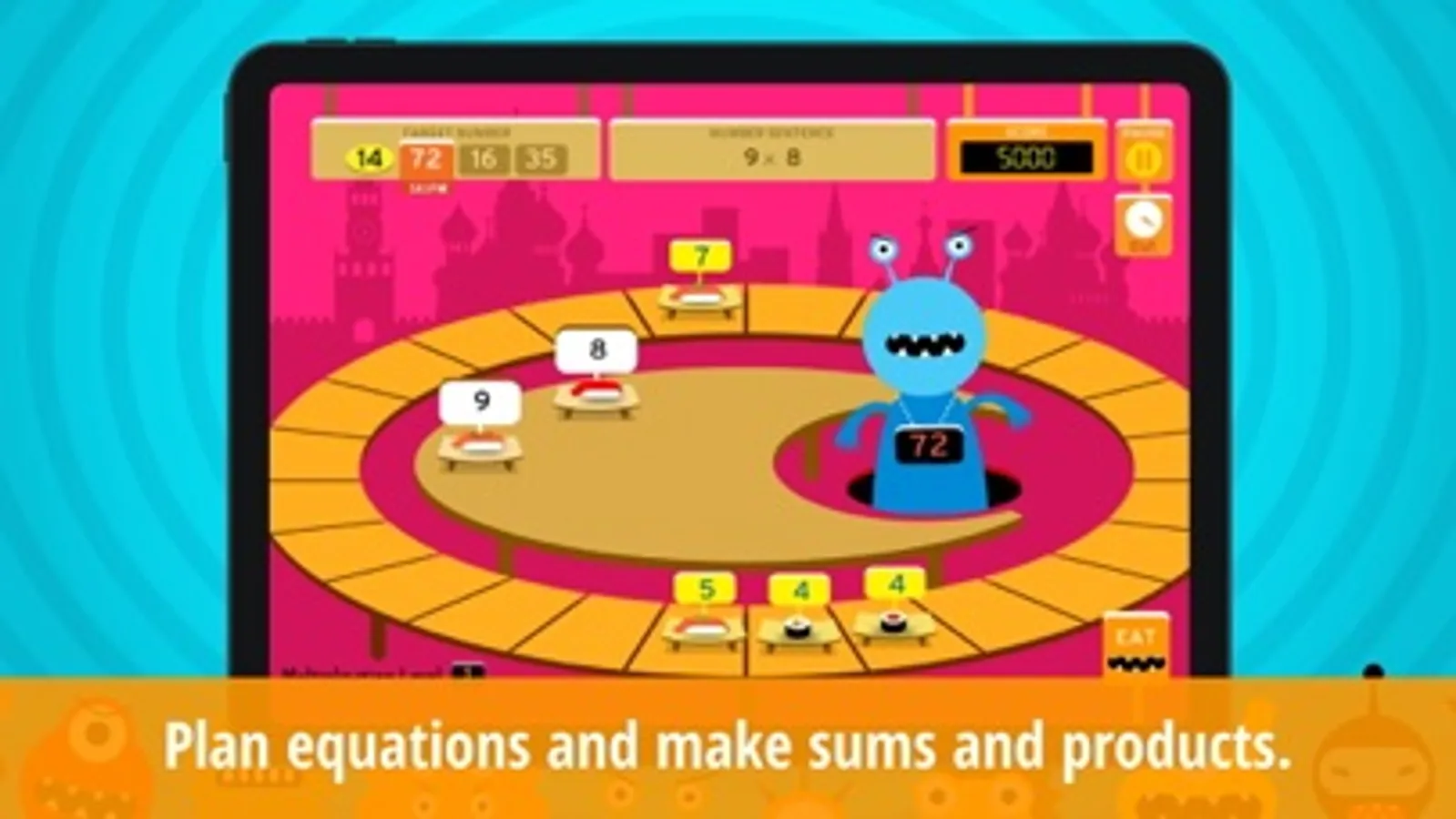 • Sushi Monster World Tour: Feed monsters with sushi rolls by making sums and products. Use speed and accuracy to place sushi pieces near the monster to make the target number. Plan the equations to ensure the monster enjoys the meal.