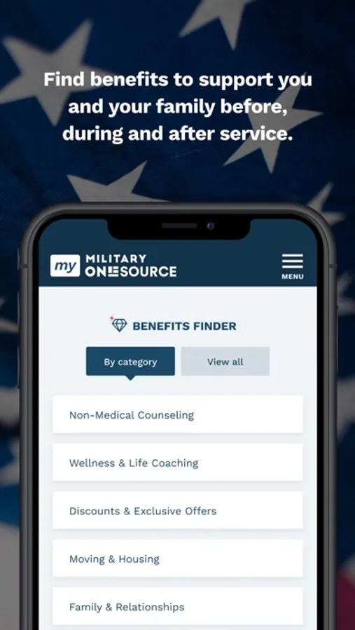 • BENEFITS FINDER: Find, learn and manage the benefits available to you through service. View all or by category. Benefits cards deliver top-line information to help you review quickly.
