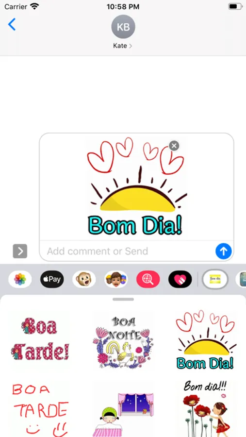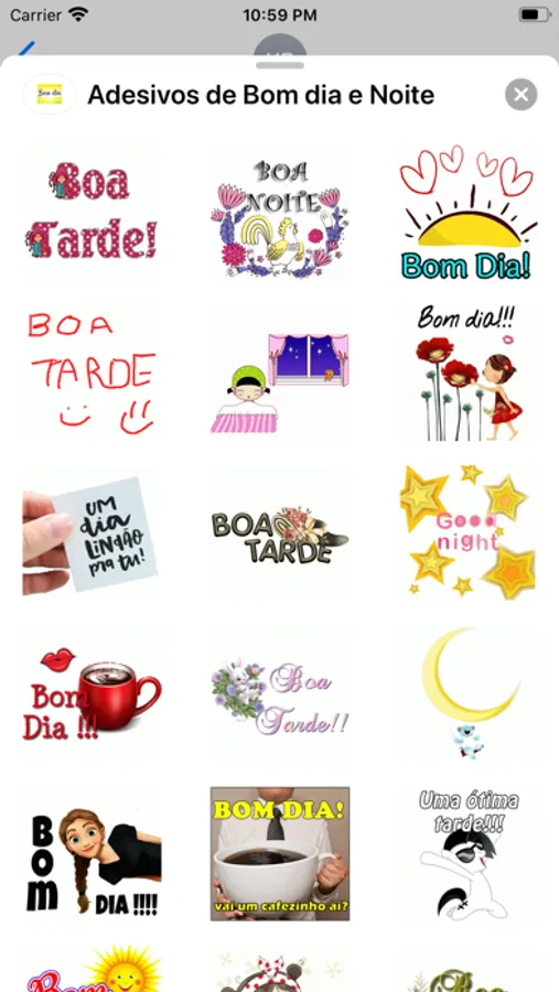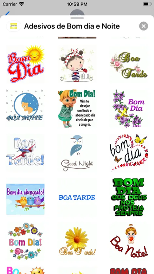 Contêm figurinhas para utilizar no seu dia a dia, tais como bom dia, boa tarde e boa noite,