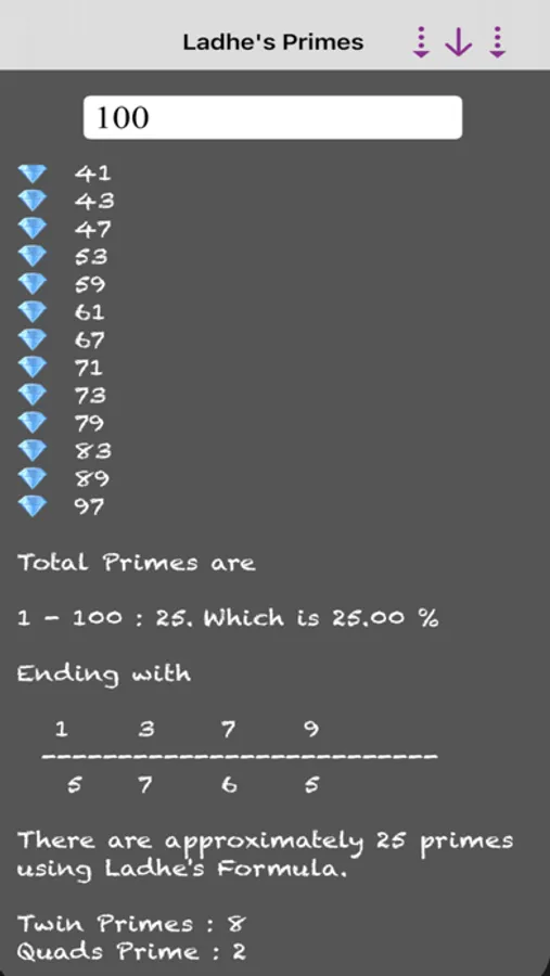 *We are displaying important information like , Primes, Prime Counts, Percentage , highest/lowest no of primes per 100 , Highest gap in 2 primes! Ending with 1,3,7,9 details.