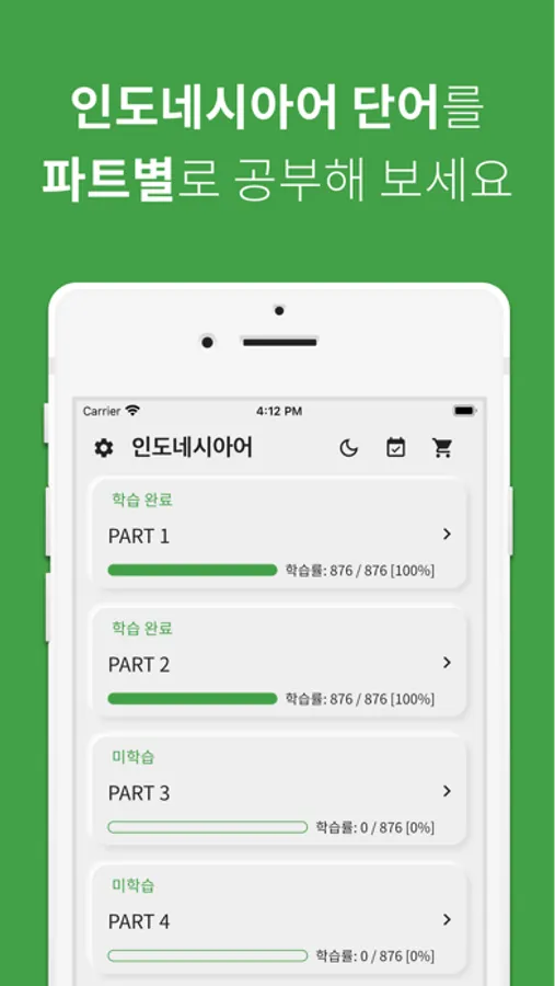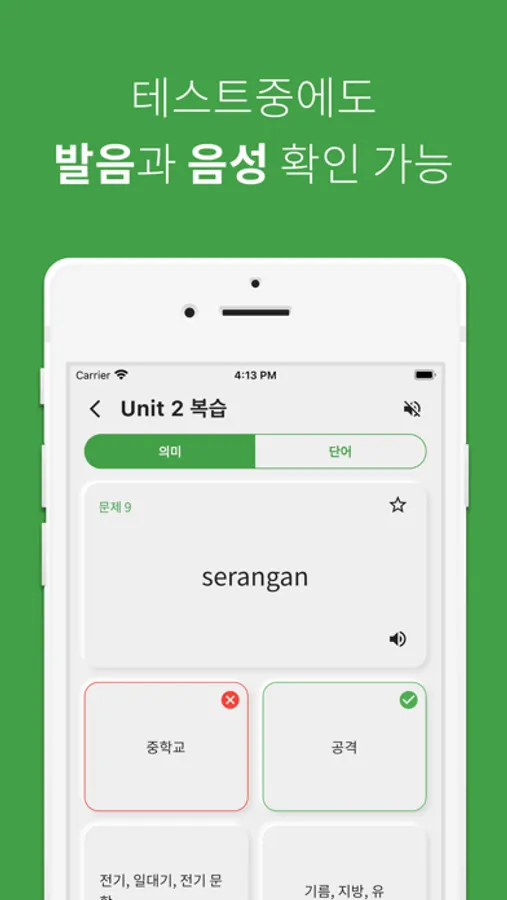 단어 공부는 역시 반복이죠! 공부한 인도네시아어 단어를 파트별, 유닛별, 전체 단위별로 복습할 수 있습니다.